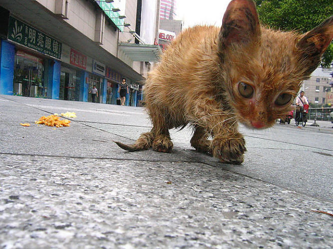 Облезлый, одноухий, с больной лапой.